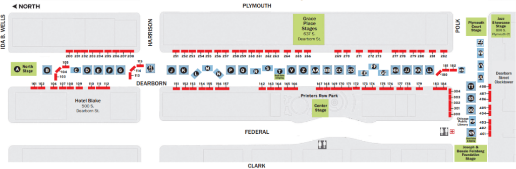 Printer’s Row Lit Fest is Located on South Dearborn Street from Ida B. Wells to Polk Street. View the map below for more details.